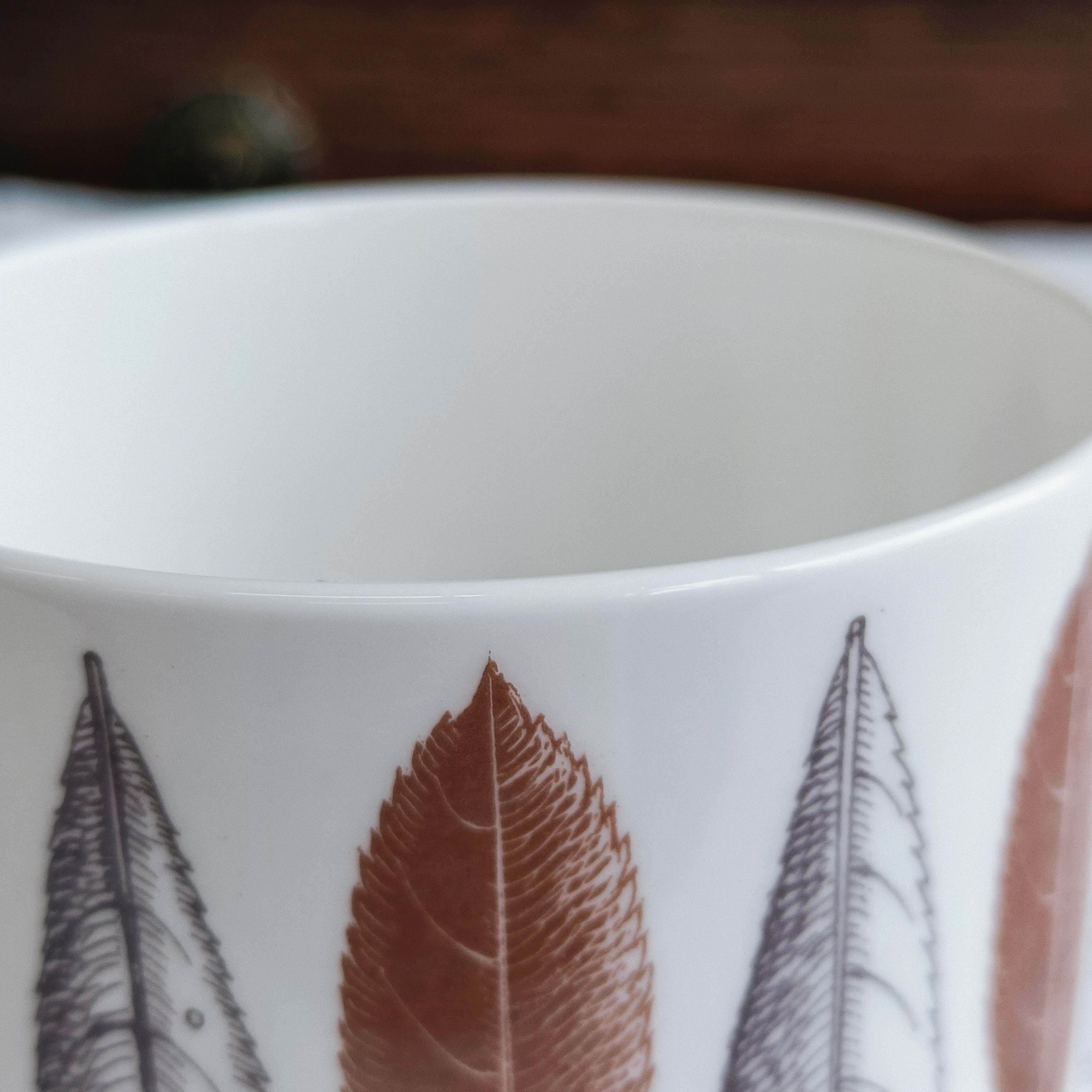 赤褐色とチャコールグレーの色合いで描かれた葉っぱの模様に
