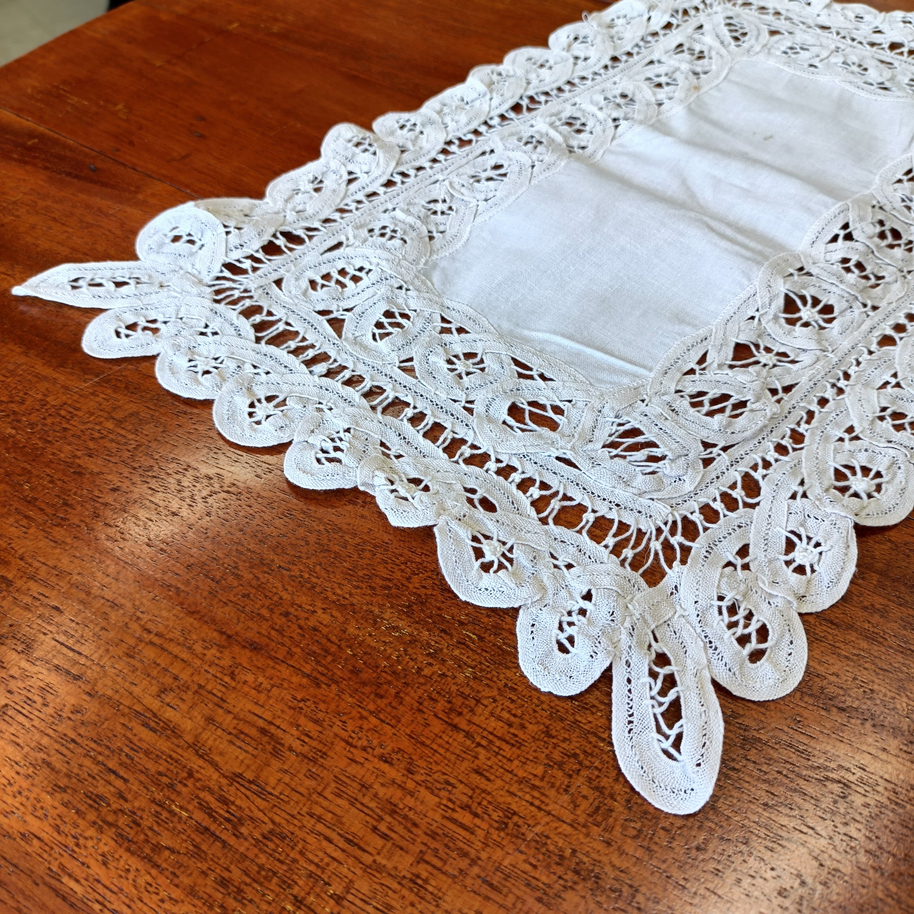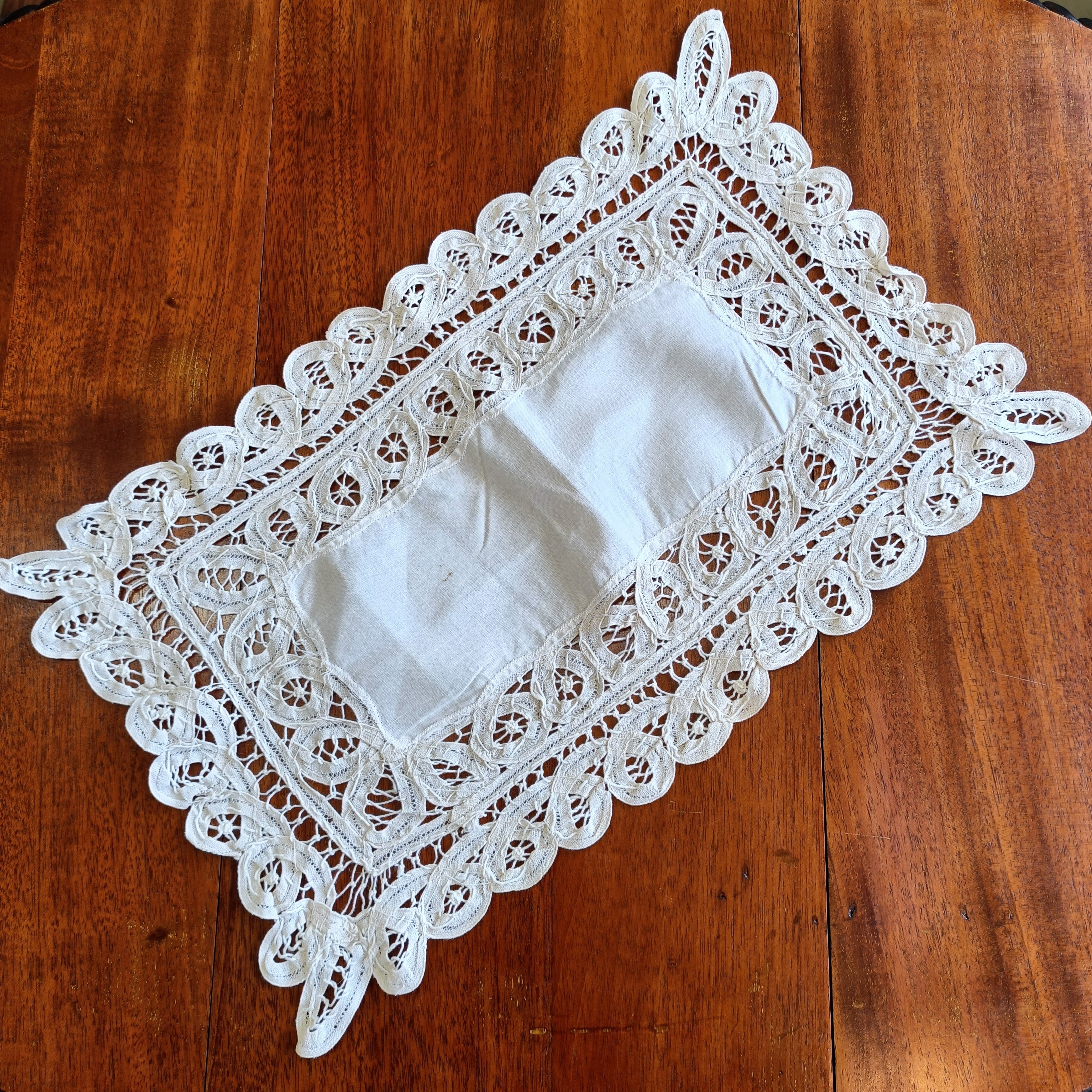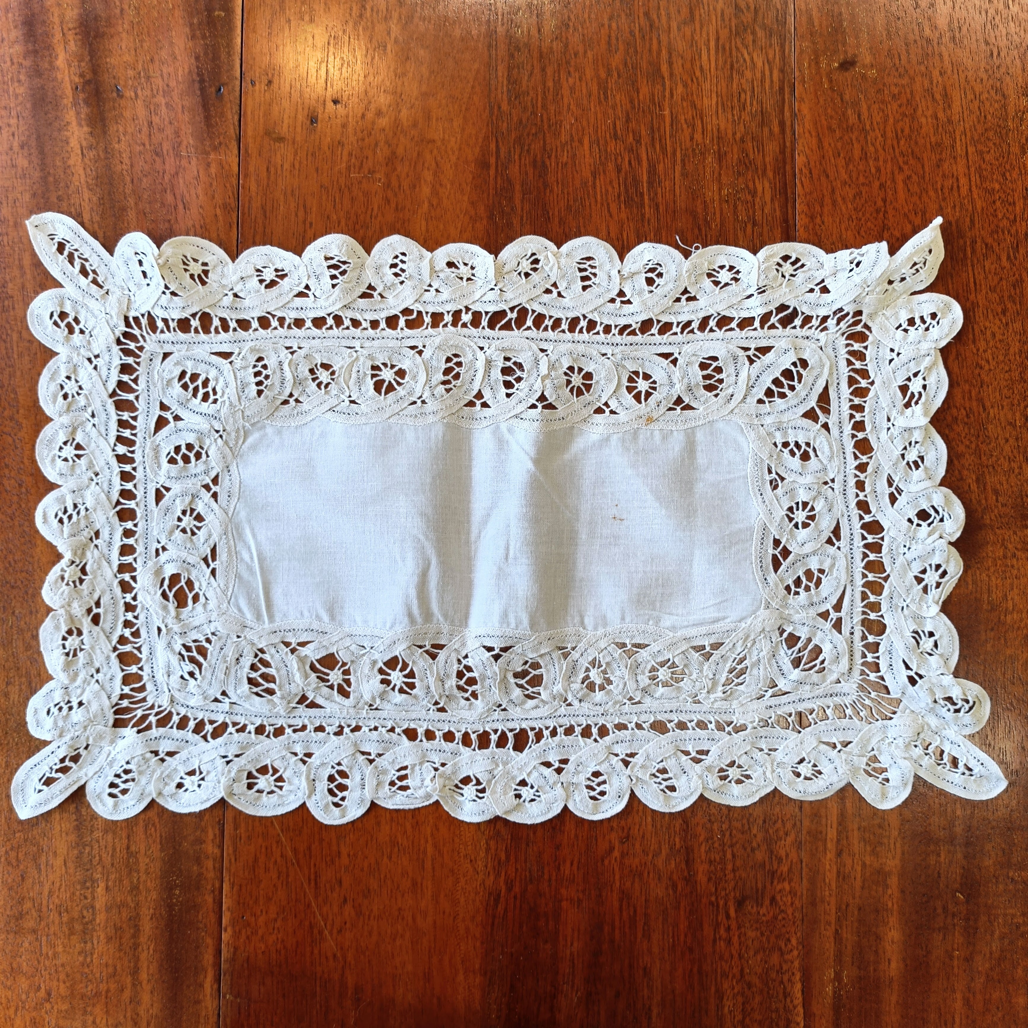 バテンレースに縁取られた、長方形の可愛らしいテーブルドイリー。