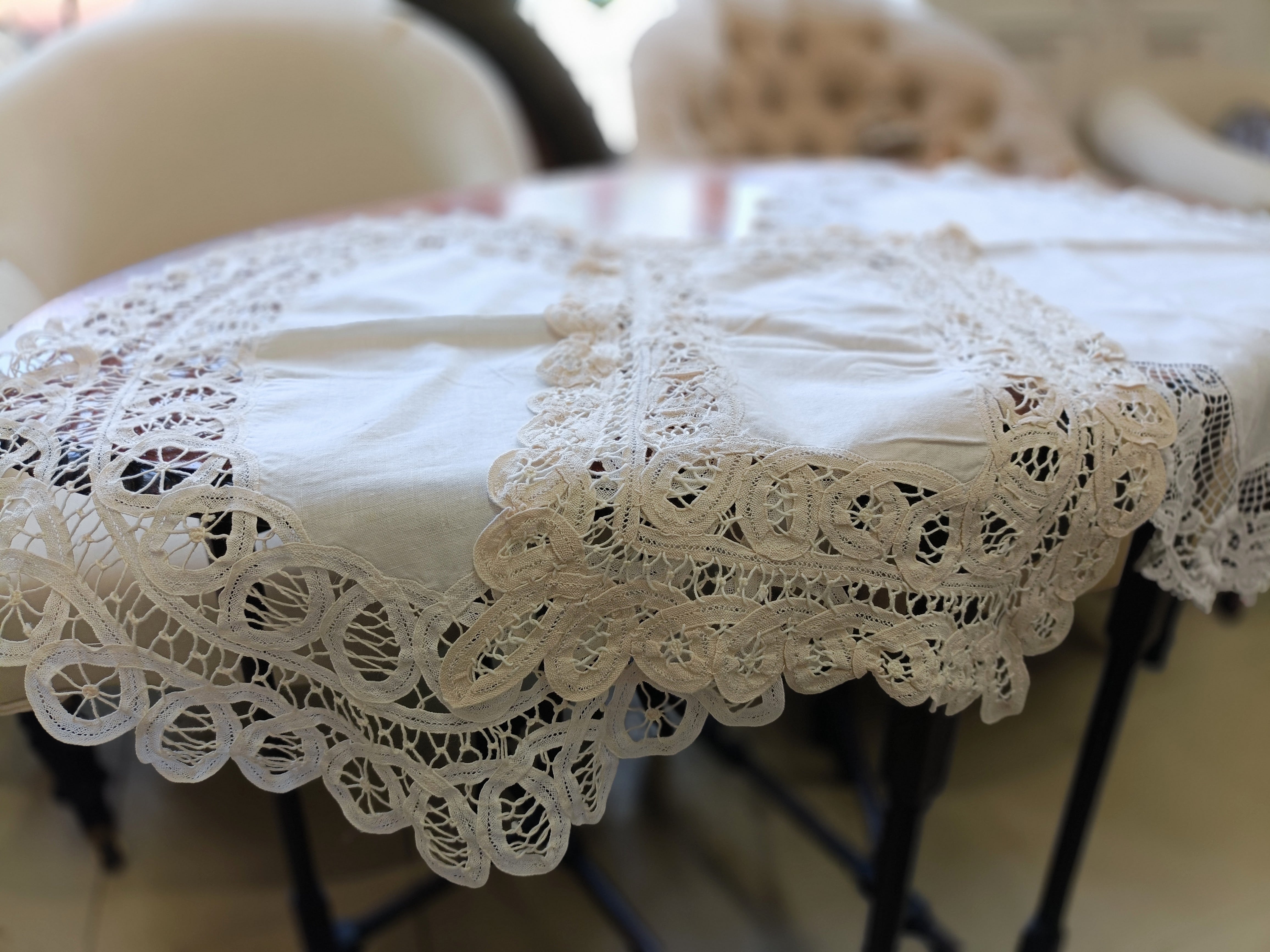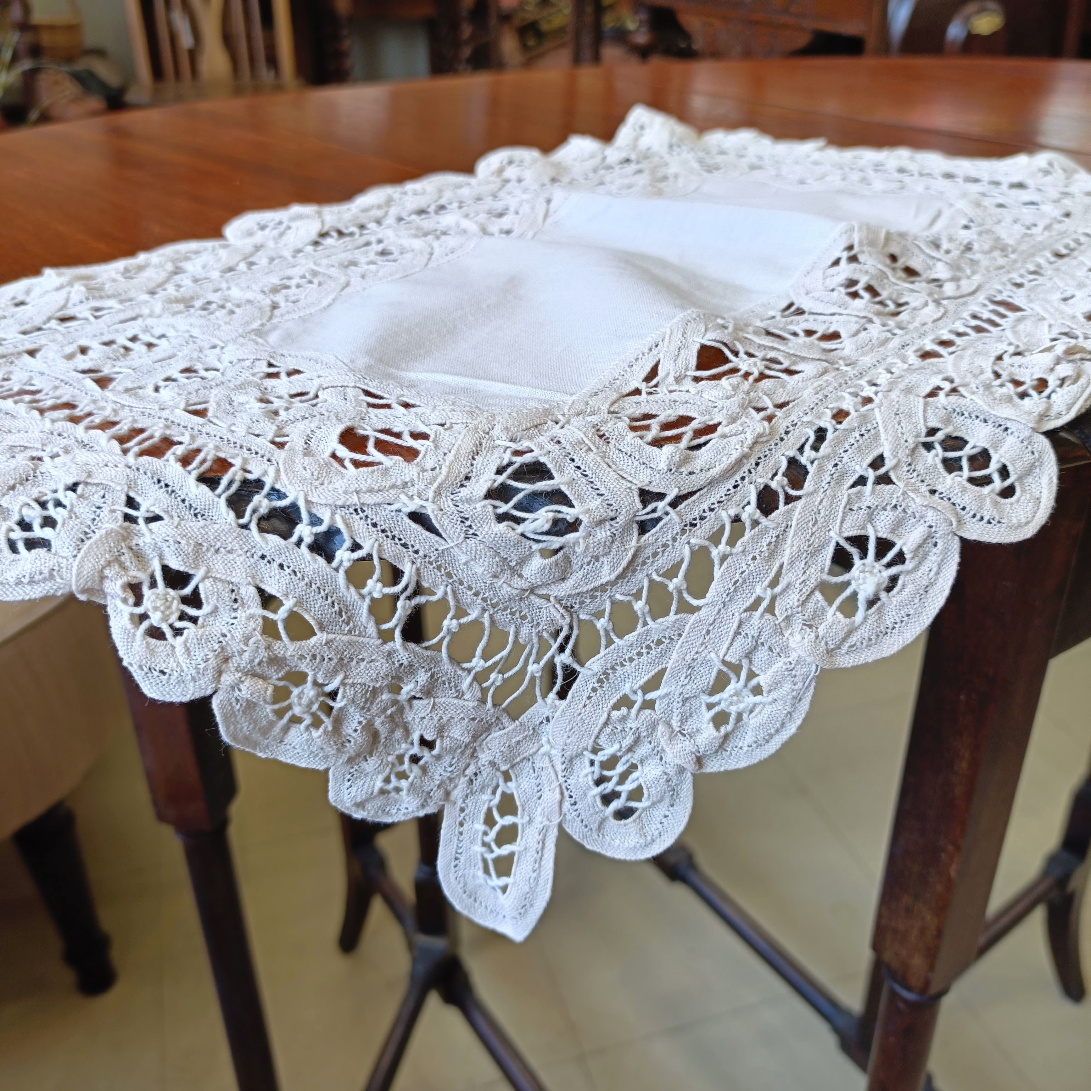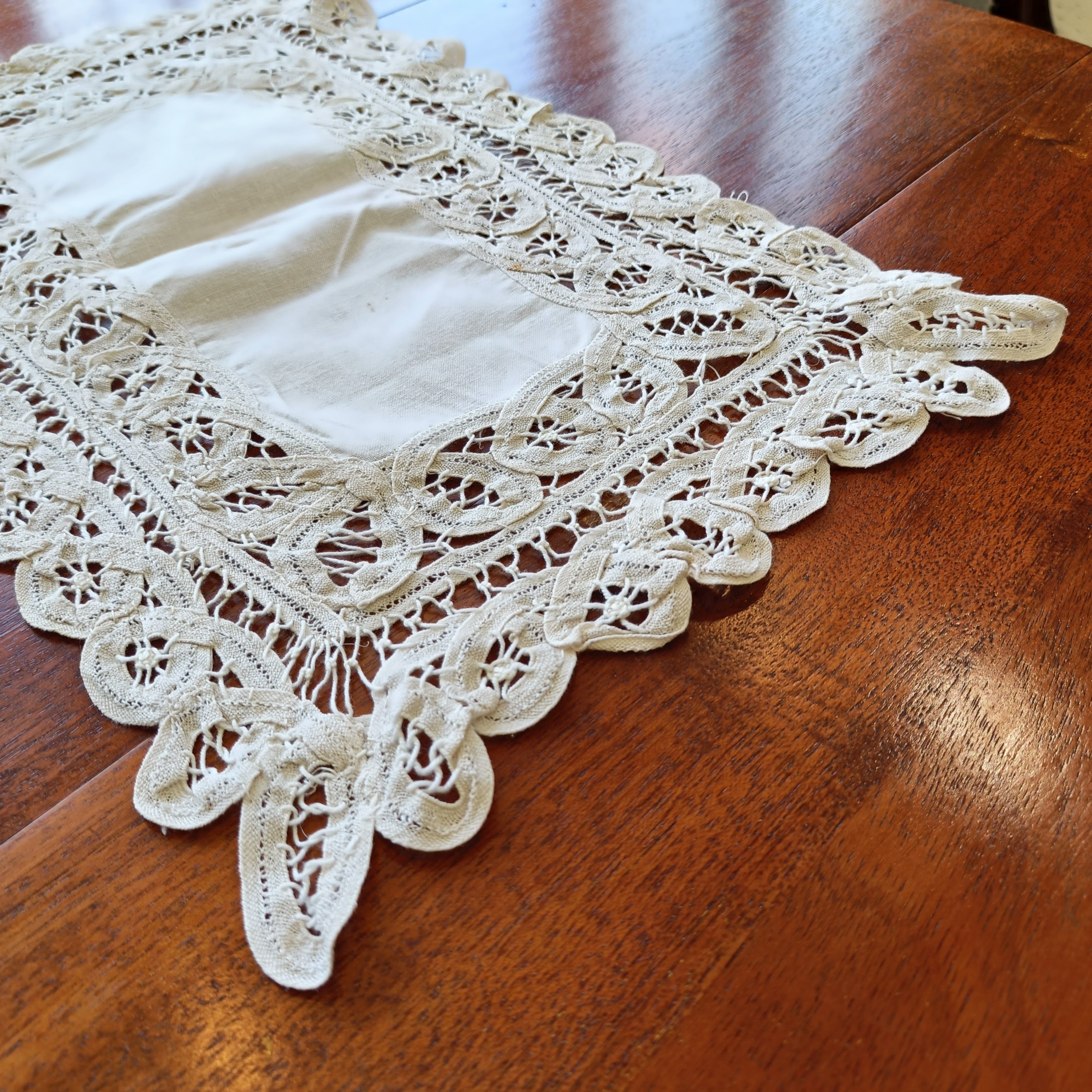 バテンレースに縁取られた、長方形の可愛らしいテーブルドイリー。